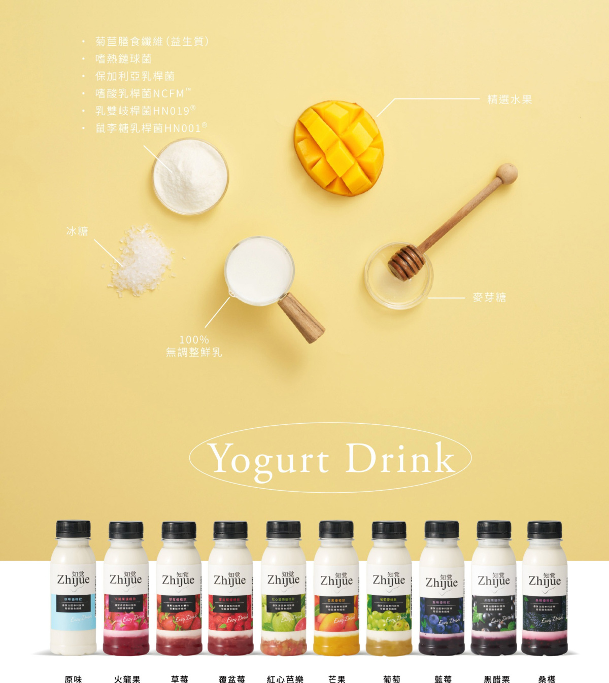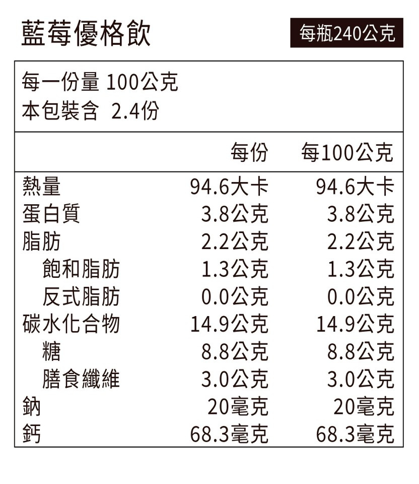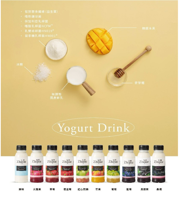 成分:優格[鮮乳、水、菊苣纖維(益生質)、保加利亞乳桿菌、嗜熱鏈球菌、乳雙岐桿菌HN019、嗜酸乳桿菌NCFM、鼠李糖乳桿菌HN001]、果醬(藍莓/草莓/黑醋栗/桑椹、麥芽糖、冰糖、水、關華豆膠)